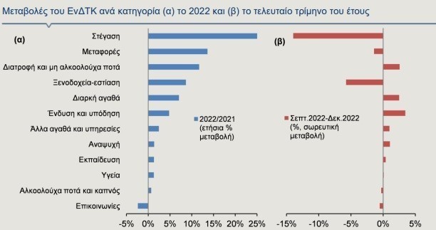 Όσον αφορά στις επιμέρους κατηγορίες που απαρτίζουν τον ΕνΔΤΚ, οι μεγαλύτερες αυξήσεις το 2022 καταγράφηκαν στις κατηγορίες στέγαση (25%) και μεταφορές (13,6%), οι οποίες επηρεάστηκαν σε μεγάλο βαθμό από τις αυξήσεις των τιμών της ενέργειας. Οι κατηγορίες διατροφή και μη αλκοολούχα ποτά (11,7%), ξενοδοχεία-εστίαση (8,7%), διαρκή αγαθά (7,1%) και ένδυση και υπόδηση (4,8%) σημείωσαν επίσης σημαντική άνοδο, ενώ μόνο οι επικοινωνίες (-2,4%) κατέγραψαν αρνητικό ρυθμό μεταβολής κατά το περασμένο έτος. Επιπρόσθετα, ο δείκτης που περιλαμβάνει το σύνολο των αγαθών αυξήθηκε κατά 12,9% κατά το περασμένο έτος, έναντι αύξησης 4,5% για τις υπηρεσίες.