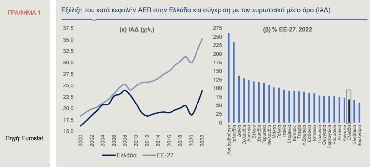 Το πραγματικό ΑΕΠ της χώρας μας αναμένεται, σύμφωνα με τις διαθέσιμες προβλέψεις, να αυξηθεί με ρυθμό υψηλότερο από τον μέσο όρο της ΕΕ-27 την επόμενη διετία. Συγκεκριμένα, στις χειμερινές προβλέψεις της η Ευρωπαϊκή Επιτροπή (European Economic Forecast, Winter 2023) εκτιμά ότι το ΑΕΠ θα αυξηθεί το 2023 κατά 0,8% στην ΕΕ-27 και 1,2% στη χώρα μας, ενώ, βάσει των πιο πρόσφατων εκτιμήσεων, ο ρυθμός μεγέθυνσης της Ελλάδας για το τρέχον έτος θα υπερβεί το 2% (Τράπεζα της Ελλάδος – Έκθεση του Διοικητή για το 2022, Διεθνές Νομισματικό Ταμείο – World Economic Outlook, April 2022). Ως εκ τούτου, η αναλογία του κατά κεφαλήν ΑΕΠ προς τον ευρωπαϊκό μέσο εν μέρει θα βελτιωθεί.