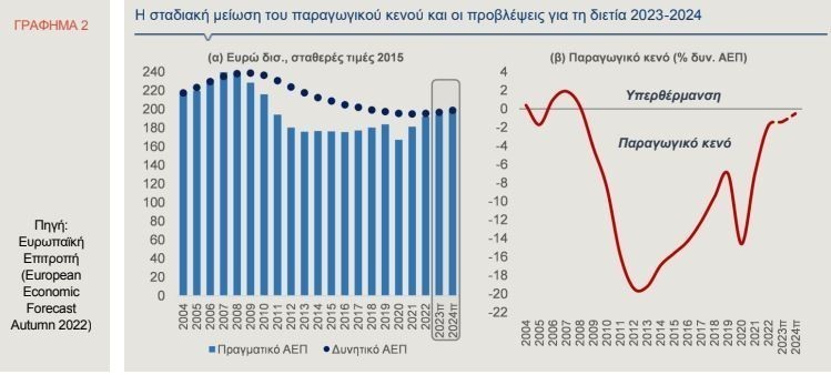 Η επιστροφή σε θετικούς ρυθμούς οικονομικής μεγέθυνσης από το 2017 και μετά, οδήγησαν στη σταδιακή συρρίκνωση του παραγωγικού κενού, το οποίο, παρά την προσωρινή διεύρυνσή του το 2020, λόγω της πανδημίας και του περιορισμού της οικονομικής δραστηριότητας, διαμορφώθηκε σε -1,8% το 2022, σύμφωνα με τις εκτιμήσεις της Ευρωπαϊκής Επιτροπής (European Economic Forecast, Autumn 2022) αλλά και του Διεθνούς Νομισματικού Ταμείου (World Economic Outlook, April 2022).