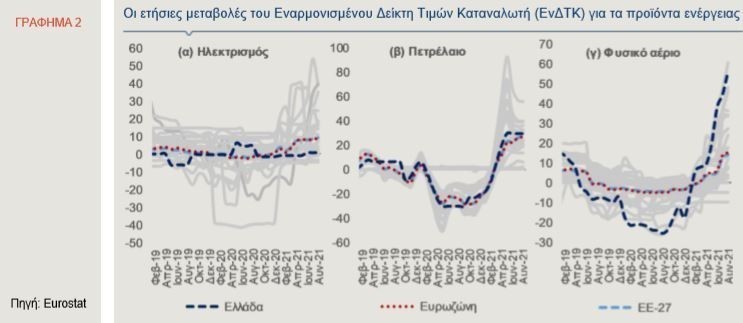 Οι ανωτέρω αυξήσεις αντανακλώνται και στις ετήσιες μεταβολές του Εναρμονισμένου Δείκτη Τιμών Καταναλωτή (ΕνΔΤΚ) για τα εν λόγω προϊόντα (πετρέλαιο, φυσικό αέριο), αλλά και για την ηλεκτρική ενέργεια. Η τιμή της τελευταίας επίσης ακολουθεί ανοδική τροχιά, εξαιτίας της αύξησης των τιμών των δικαιωμάτων εκπομπών ρύπων διοξειδίου του άνθρακα, στην Ευρωπαϊκή Ένωση, της συνεπακόλουθης αύξησης της τιμής του φυσικού αερίου προς το οποίο εστράφη η ζήτηση αλλά και των καιρικών συνθηκών που επικράτησαν το καλοκαίρι που είχαν ως αποτέλεσμα τη μειωμένη παραγωγή ενέργειας από ανανεώσιμες πηγές.