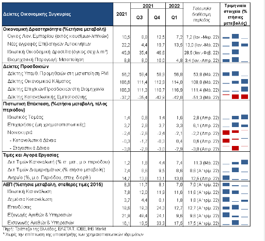 Παράλληλα με την πτώση του μη μισθολογικού κόστους της εργασίας, ο κατώτατος μισθός στην Ελλάδα αυξήθηκε σταδιακά σε Ευρώ 713, τον Μάιο του 2022, από Ευρώ 663, τον Ιανουάριο του τρέχοντος έτους και Ευρώ 650, τον Δεκέμβριο του 2021, με τη σωρευτική ποσοστιαία μεταβολή να έχει διαμορφωθεί σε 9,7%. Επιπρόσθετα, το ακαθάριστο διαθέσιμο εισόδημα, σύμφωνα με τα τελευταία διαθέσιμα στοιχεία της ΕΛΣΤΑΤ, αυξήθηκε κατά 5,8% το 2021. Από την άλλη πλευρά, η αξιοσημείωτη άνοδος του επιπέδου των τιμών -κυρίως στην ενέργεια και τα τρόφιμα-, που έχει ξεκινήσει από το φθινόπωρο του 2021 και εντάθηκε μετά τη ρωσική εισβολή στην Ουκρανία, ασκεί πιέσεις στο πραγματικό διαθέσιμο εισόδημα των πολιτών, καθώς διαβρώνει την αγοραστική τους δύναμη. Σημειώνεται ότι ο μέσος Εναρμονισμένος Δείκτης Τιμών Καταναλωτή σημείωσε άνοδο κατά 7,9% σε ετήσια βάση, το πρώτο πεντάμηνο του 2022.