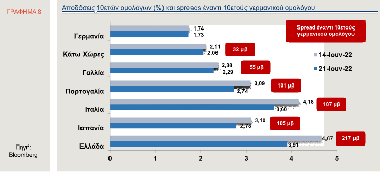 Στην ελληνική αγορά ομολόγων, το εύρος της απόδοσης του δεκαετούς κρατικού ομολόγου, λήξης 18 Ιουνίου 2032, με κουπόνι 1,75%, διαμορφωνόταν, στις 21 Ιουνίου, μεταξύ 3,90% και 3,99%. Επιπλέον, το δεκαετές ομόλογο της Πορτογαλίας κατέγραφε απόδοση 2,74%, της Ιταλίας 3,60% και της Ισπανίας 2,78% (Γράφημα 8). Η διαφορά απόδοσης μεταξύ του δεκαετούς ομολόγου της Ελλάδας και του δεκαετούς ομολόγου της Γερμανίας (spread) διαμορφωνόταν στις 217 μονάδες βάσης (μ.β.), του δεκαετούς πορτογαλικού ομολόγου στις 101 μ.β., ενώ του δεκαετούς ιταλικού ομολόγου στις 187 μ.β. Παράλληλα, η απόδοση του δεκαετούς ομολόγου της Γερμανίας, ως σημείο αναφοράς του κόστους δανεισμού της Ζώνης του Ευρώ (ΖτΕ), διαμορφωνόταν στο 1,73%, στις 21 Ιουνίου, ενώ η απόδοση του δεκαετούς ομολόγου των ΗΠΑ στο 3,27%.