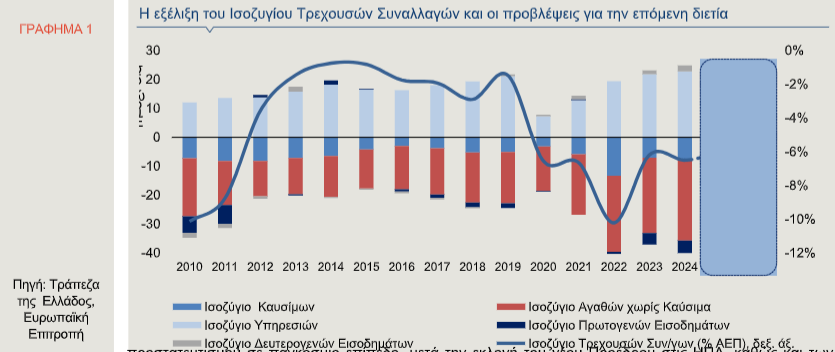 Σύμφωνα με τις προβλέψεις της Τράπεζας της Ελλάδος, το έλλειμμα του ΙΤΣ αναμένεται να υποχωρήσει στο 6% του ΑΕΠ το 2025 και στο 5,2% του ΑΕΠ το 2026, έναντι εκτίμησης για 6,5% του ΑΕΠ το 2024.