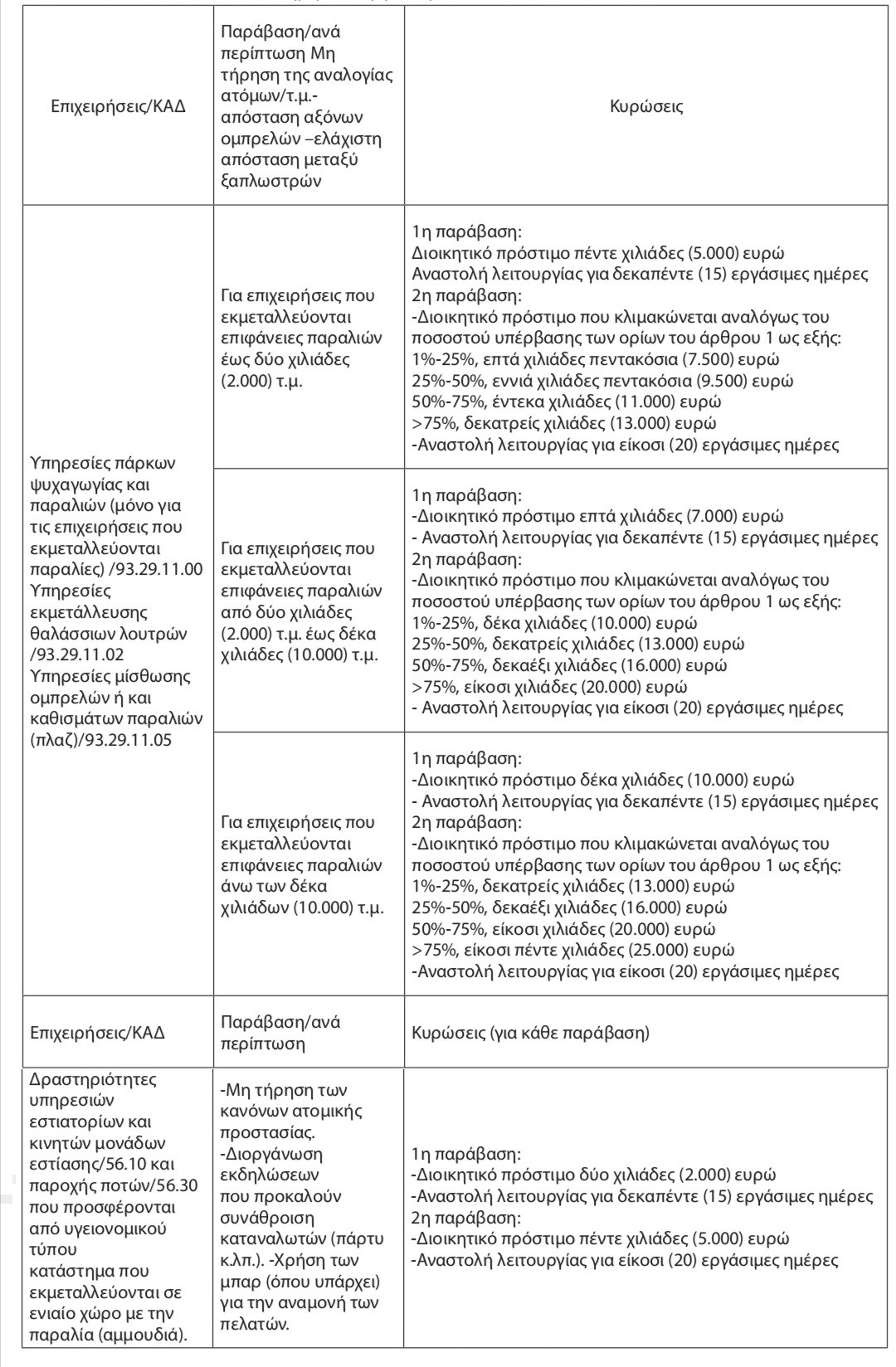 Στις επιχειρήσεις που παραβιάζουν τους παραπάνω κανόνες επιβάλλεται, ανάλογα με τον βαθμό διακινδύνευσης της δημόσιεας υγείας για κάθε παράβαση, διοικητικό πρόστιμο από 5.000 ευρώ έως 25.000 ευρώ και αναστολή λειτουργίας για χρονικό διάστημα από 15 έως 20 ημέρες.
