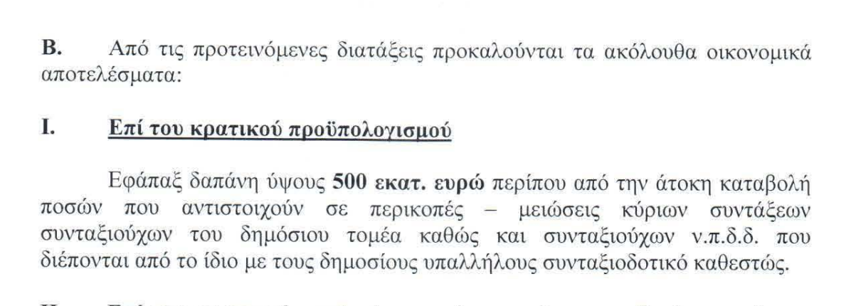 Σύμφωνα με την Έκθεση του Γενικού Λογιστηρίου, από την διάταξη αυτή προκύπτει «εφάπαξ δαπάνη ύψους 500 εκατ. ευρώ» για την άτοκη καταβολή ποσών που αντιστοιχούν σε περικοπές – μειώσεις κύριων συντάξεων συνταξιούχων του δημοσίου τομέα, καθώς και συνταξιούχων ΝΠΔΔ που διέπονται από το ίδιο με τους δημοσίους υπαλλήλους συνταξιοδοτικό καθεστώς.