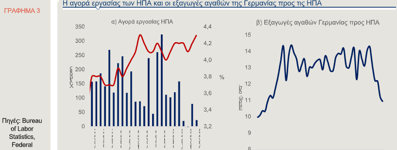 Το περασμένο έτος, πολλοί αναλυτές εκτιμούσαν ότι η αύξηση των αμερικανικών δασμών επί των εξαγωγών αγαθών από την ευρωζώνη (από 1,5% το 2024 σε 13,1% σήμερα, ECB macroeconomic projections, September 2025) θα προκαλούσε ισχυρό αρνητικό σοκ στην ευρωπαϊκή οικονομία, όπως αναφέρεται στο Δελτίο Οικονομικών Εξελίξεων του Economic Research της Alpha Bank.