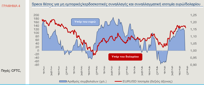 Σύμφωνα με τα στοιχεία του Χρηματιστηρίου του Σικάγου, οι συνολικές καθαρές τοποθετήσεις (αγορές μείον πωλήσεις) στην ισοτιμία του ευρώ με το δολάριο παρέμειναν θετικές, την εβδομάδα που έληξε στις 26 Σεπτεμβρίου. Οι θετικές θέσεις (υπέρ του ευρώ ‟long”) μειώθηκαν κατά 3.414 συμβόλαια, με αποτέλεσμα οι συνολικές καθαρές θέσεις να διαμορφωθούν στα 114.345 συμβόλαια από 117.759 συμβόλαια, την προηγούμενη εβδομάδα (Γράφημα 4).