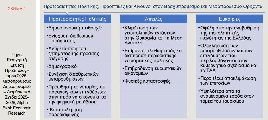 Στο παρόν Δελτίο η Alpha Bank παραθέτει, εν συντομία, τις προτεραιότητες πολιτικής βραχυπρόθεσμα και μεσοπρόθεσμα που στόχο έχουν να ενισχύσουν την ανθεκτικότητα της ελληνικής οικονομίας, τους κινδύνους που μπορεί να απειλήσουν την επίτευξη εύρωστων ρυθμών οικονομικής μεγέθυνσης το 2025 αλλά και στο μεσοπρόθεσμο ορίζοντα και τέλος, τις ευκαιρίες που αναδύονται στην παρούσα συγκυρία για την ελληνική οικονομία.