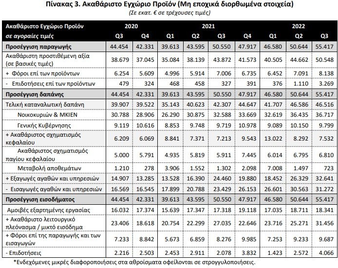 - Το μη εποχικά διορθωμένο ΑΕΠ (σε όρους όγκου) κατέγραψε άνοδο κατά 2,1% σε σχέση με το γ’ τρίμηνο του 2021.