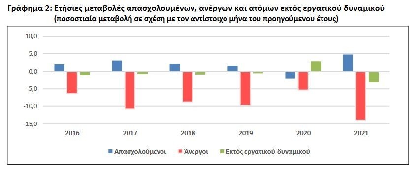 Οι άνεργοι ανήλθαν σε 664.384 άτομα σημειώνοντας μείωση κατά 108.058 άτομα σε σχέση με τον Ιούλιο του 2020 (-14,0%) και κατά 40.485 άτομα σε σχέση με τον Ιούνιο του 2021 (-5,7%).