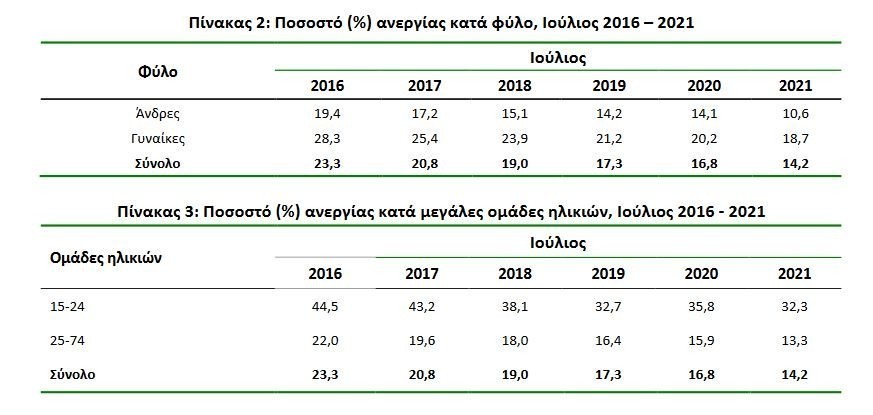 Την ίδια ώρα οι απασχολούμενοι ανήλθαν σε 4.011.357 άτομα σημειώνοντας αύξηση κατά 182.886 άτομα σε σχέση με τον Ιούλιο του 2020 (+4,8%) και κατά 8.221 άτομα σε σχέση με τον Ιούνιο του 2021 (+0,2%).