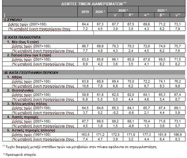 -Για το γ΄ τρίμηνο του 2021, ο ετήσιος ρυθμός μεταβολής των τιμών των διαμερισμάτων για το σύνολο της χώρας (σε ονομαστικούς όρους) διαμορφώθηκε στο 7,9% σε σύγκριση με το αντίστοιχο τρίμηνο του 2020.