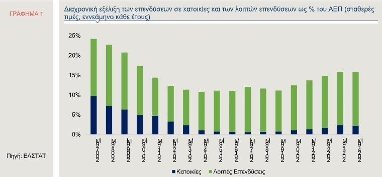 Ως προς την ανάλυση των επενδύσεων ανά κατηγορία, αύξηση το πρώτο εννεάμηνο κατέγραψαν οι επενδύσεις σε λοιπές κατασκευές εκτός κατοικιών (5,6%) και σε μηχανολογικό και τεχνολογικό εξοπλισμό (5,4%). Αντίθετα, μείωση σε ετήσια βάση σημείωσαν οι επενδύσεις σε κατοικίες (4,6%), σε μεταφορικό εξοπλισμό (1,3%), καθώς και οι λοιπές επενδύσεις (0,6%). Αξίζει να σημειωθεί η μεταβολή της διάρθρωσης των επενδύσεων που έχει συντελεστεί με την πάροδο των ετών. Συγκεκριμένα, το πρώτο εννεάμηνο του 2007, πριν δηλαδή την οικονομική κρίση, οι επενδύσεις σε κατοικίες αποτελούσαν μία κυρίαρχη μορφή επενδύσεων, αντιπροσωπεύοντας πάνω από το 40% αυτών, ενώ το ποσοστό τους στο ΑΕΠ ανερχόταν περίπου στο 10%. Το 2024, οι επενδύσεις σε κατοικίες αποτέλεσαν το 14,3% των συνολικών επενδύσεων το πρώτο εννεάμηνο του έτους, ενώ το ποσοστό τους στο ΑΕΠ διαμορφώθηκε στο 2,3%. Τα δύο αυτά ποσοστά έχουν αυξηθεί τα τελευταία έτη, απέχουν όμως σημαντικά από τα αντίστοιχα ποσοστά του 2007.