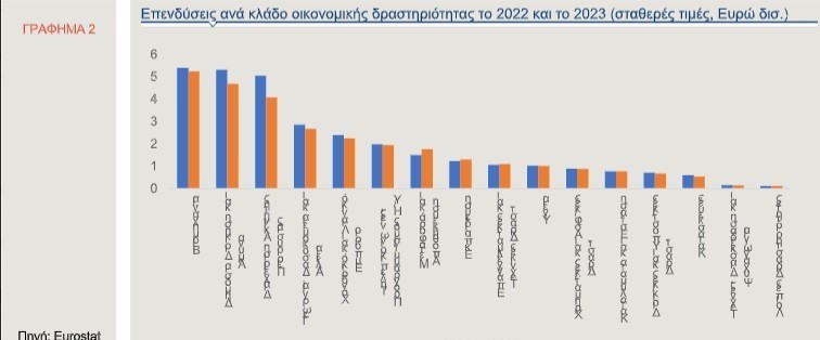 Όσον αφορά στις επενδύσεις ανά κλάδο οικονομικής δραστηριότητας, σύμφωνα με τα πρόσφατα αναρτημένα στην Eurostat ετήσια στοιχεία, πάνω από τις μισές συγκεντρώθηκαν σε τρεις κλάδους το 2023, δηλαδή στη βιομηχανία, στη δημόσια διοίκηση και άμυνα και στη διαχείριση ακίνητης περιουσίας. Συγκεκριμένα, οι περισσότερες επενδύσεις καταγράφονται στον κλάδο της βιομηχανίας, με συνολικό ύψος ευρώ 5,4 δισ. έναντι Ευρώ 5,2 δισ. το 2022. Σημειώνεται ότι θετικοί ρυθμοί ετήσιας μεταβολής καταγράφονται στις βιομηχανικές επενδύσεις από το 2018, με τις σωρευτικές επενδύσεις στον κλάδο να ανέρχονται την τελευταία εξαετία σε Ευρώ 27,3 δισ. και πάνω από τις μισές να κατευθύνονται στη μεταποίηση. Παράλληλα, στον κλάδο της δημόσιας διοίκησης και άμυνας, οι επενδύσεις υπερέβησαν τα Ευρώ 5,3 δισ. το 2023 (+13,4%), διατηρώντας θετικό ρυθμό μεταβολής για τέταρτο διαδοχικό έτος. Εξίσου σημαντικές είναι οι επενδύσεις στον τομέα της διαχείρισης ακίνητης περιουσίας, οι οποίες ανήλθαν σε Ευρώ 5 δισ., αυξημένες κατά περίπου Ευρώ 1 δισ. έναντι του 2022. Οι επενδύσεις ωστόσο, στον εν λόγω κλάδο υπολείπονται σημαντικά των αντίστοιχων πριν την οικονομική κρίση (2007: Ευρώ 25,6 δισ.). Σημειώνεται ότι οι επενδύσεις σε τρεις κλάδους κατέγραψαν ετήσια μείωση το 2023, με τη μεγαλύτερη εξ αυτών να σημειώνεται στη μεταφορά και αποθήκευση (-14%, έναντι +37% το 2022), ενώ ακολούθησαν η εκπαίδευση (-5,6%) και οι επαγγελματικές και τεχνικές δραστηριότητες (-3,3%).
