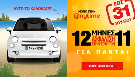 Τώρα η Anytime κάνει το καλοκαίρι σου ακόμα πιο ξένοιαστο. Σου δίνει τη δυνατότητα να κάνεις ετήσια ασφάλεια αυτοκινήτου, πληρώνοντας μόνο 11 μήνες.
