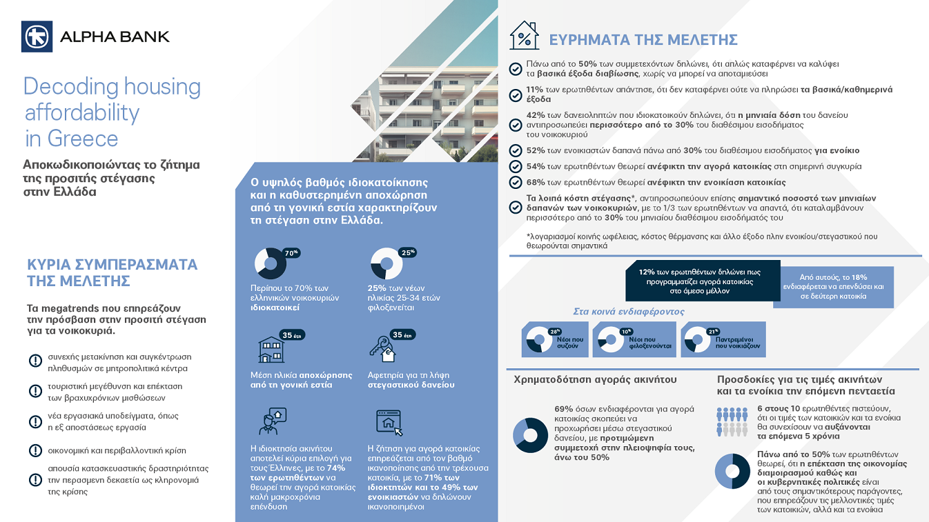Το ζήτημα της προσιτής κατοικίας στην Ελλάδα εξετάζει νέα οικονομική μελέτη της Alpha Bank καθώς η υψηλότερη ταχύτητα με την οποία κινούνται οι τιμές των ακινήτων σε σχέση με το διαθέσιμο εισόδημα των νοικοκυριών αντανακλά την επιδείνωση των συνθηκών απόκτησης προσιτής κατοικίας στη χώρα μας.