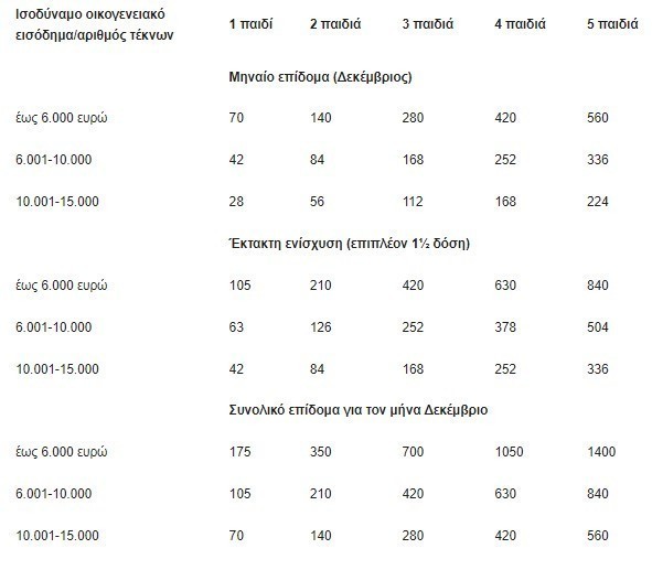 Υπενθυμίζεται ότι το μηνιαίο ποσό του επιδόματος ανέρχεται σε 70 ή 42 ή 28 ευρώ για κάθε παιδί για το πρώτο και δεύτερο παιδί ανά μήνα, ανάλογα με το ύψος του εισοδήματος και σε 140 ή 84 ή 56 από το τρίτο και για κάθε επόμενο παιδί, ανά μήνα. Συνεπώς η επιπλέον ενίσχυση για τον μήνα Δεκέμβριο (χωρίς να συνυπολογίζεται η παροχή Νοεμβρίου) αναφέρεται στον ακόλουθο πίνακα και κυμαίνεται από 42 ευρώ έως και 840 ευρώ για οικογένειες με έως και 5 τέκνα: