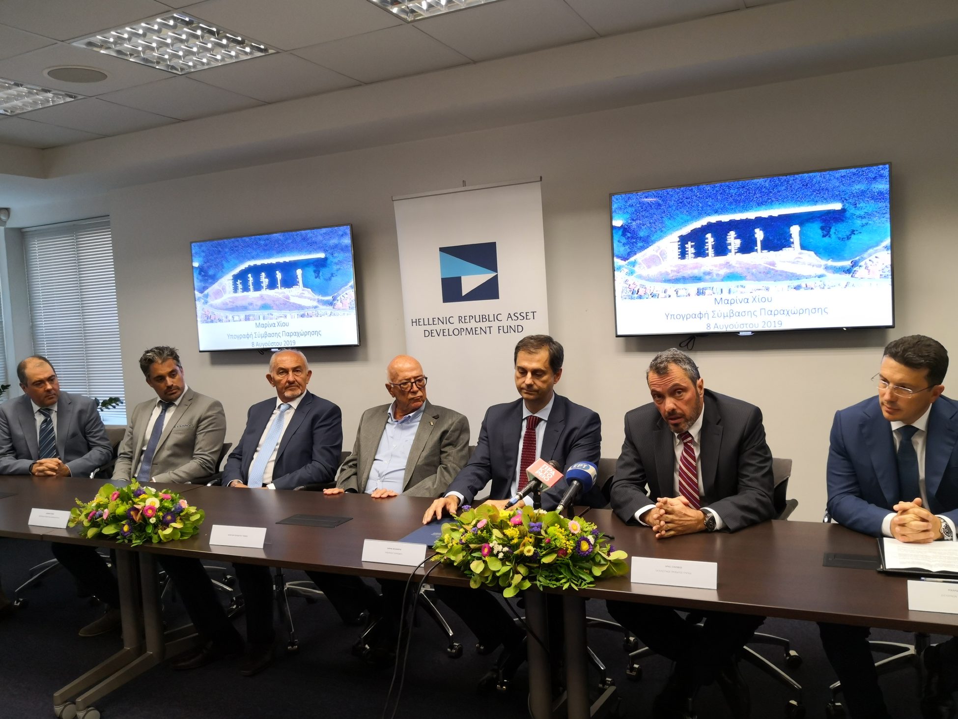 Το κοινοπρακτικό σχήμα Μαρίνα Χίου ΑΕ των εταιρειών AVLUM ENTERPRISES COMPANY LIMITED (συμφερόντων της εφοπλιστικής οικογένειας Τσάκου) – ΙΩΑΝΝΗΣ ΚΑΙ ΗΛΙΑΣ Δ. ΤΕΦΑΣ ΝΑΥΠΗΓΟΠΛΑΣΤΙΚΗ ΑΕΒΕ – ΚΛΕΟΠΑΤΡΑ ΜΑΡΙΝΑ ΑΕ και ΤΟΥΡΙΣΤΙΚΟΣ ΛΙΜΕΝΑΣ ΠΡΕΒΕΖΑΣ ΑΕ ΕΙΔΙΚΟΥ ΣΚΟΠΟΥ θα έχει το δικαίωμα χρήσης και εκμετάλλευσης της μαρίνας για τα επόμενα 40 χρόνια. Τη σύμβαση παραχώρησης υπέγραψε εκ μέρους του ελληνικού δημοσίου ο υπουργός Τουρισμού, κ. Χάρης Θεοχάρης, ο Εκτελεστικός Πρόεδρος του ΤΑΙΠΕΔ, κ. Άρης Ξενόφος και εκ μέρους των επενδυτών, ο κ. Ιωάννης Τέφας, Διευθύνων Σύμβουλος της “Μαρίνα Χίου ΑΕ”, ο κ. Μιχάλης Μπελέγρης, Πρόεδρος της “Μαρίνα Χίου ΑΕ” και ο κ. Ιωάννης Σαρόγλου, Διευθύνων Σύμβουλος της AVLUM ENTERPRISES COMPANY LIMITED. Παρών στην εκδήλωση υπογραφής ήταν και ο Καπετάν Παναγιώτης Τσάκος.
