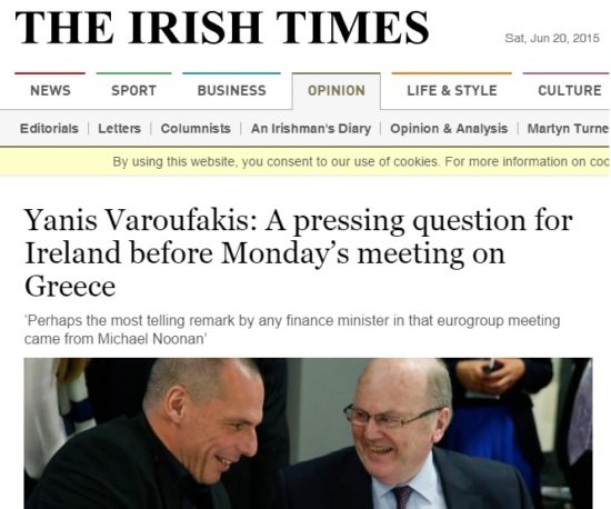 Αποκαλύψεις για το παρασκήνιο του Eurogroup της περασμένης Πέμπτης κάνει μέσω άρθρου του στους Irish Times ο Γιάνης Βαρουφάκης υποστηρίζοντας ότι ο Βόλφγκανγκ Σόιμπλε δεν επέτρεψε να παρουσιάσει τις ελληνικές προτάσεις στη συνεδρίαση του Λουξεμβούργου.