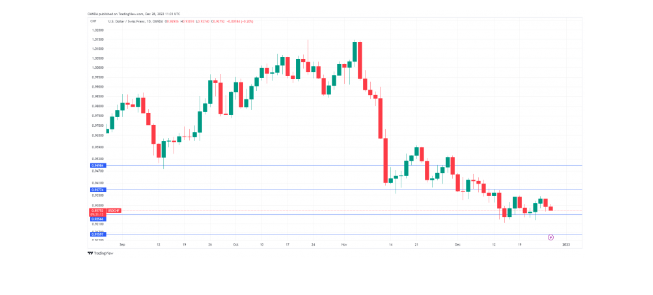 Όπως σημειώνει το market pulse της Oanda, τους τελευταίους δύο μήνες του έτους, το ελβετικό φράγκο ενισχυόταν έναντι του δολαρίου ΗΠΑ. Η ισοτιμία USD/CHF υποχώρησε 5,6% τον Νοέμβριο και επιπλέον 1,6% τον Δεκέμβριο. Στις 14 Δεκεμβρίου η ισοτιμία υποχώρησε στο 0,9215 δολ. – το χαμηλότερο επίπεδο από τον Απρίλιο.