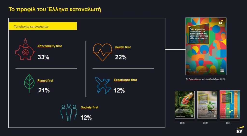Πιο συγκεκριμένα, η έρευνα EY Future Consumer Index Ελλάδα 2024 δημοσιεύτηκε τον Δεκέμβριο του 2024 και διεξήχθη σε πανελλαδικό δείγμα 500 καταναλωτών, ηλικίας 18-64 ετών. Στη διάρκεια των τεσσάρων αυτών ετών που τρέχει η έρευνα, παρακολουθήθηκαν πέντε βασικές τυπολογίες καταναλωτών, οι οποίες περιγράφουν ανθρώπους με διαφορετικές προτεραιότητες, αξίες, στάση και τρόπο ζωής.