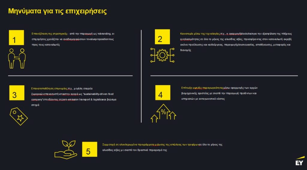 Παράλληλα, η επανατοποθέτηση επωνυμιών αποκτά στρατηγικό χαρακτήρα, όπως στην περίπτωση μεγάλης εταιρείας μακαρονιών που αναπροσδιορίζεται ως sustainability-driven food company, επενδύοντας σε βιώσιμα σιτηρά και μεταφορές μηδενικών εκπομπών. Στόχος παραμένει η επίτευξη υψηλής παραγωγικότητας, μέσα από την εφαρμογή των αρχών της βιομηχανικής αριστείας, ώστε να διασφαλιστεί η παραγωγή προϊόντων με ανταγωνιστικό κόστος.
