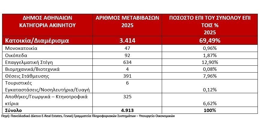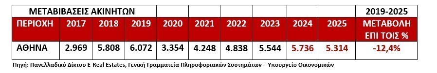 Στον Δήμο Αθηναίων, για το έτος 2025, καταγράφονται συνολικά 4.926 μεταβιβάσεις ακινήτων, έναντι 5.736 το 2024 και 5.544 το 2023.