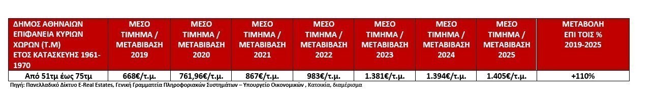 Το δημοφιλέστερο ακίνητο στον Δήμο Αθηναίων το 2025 είναι κατοικία επιφάνειας 50 -75 τ.μ., κατασκευής έως το 1980, με μέσο τίμημα 1.441 €/τ.μ., που αντιστοιχεί σε συνολική αξία από 72.050 έως 108.075 ευρώ. Η συγκεκριμένη κατηγορία συγκεντρώνει το 37,02% των μεταβιβάσεων.