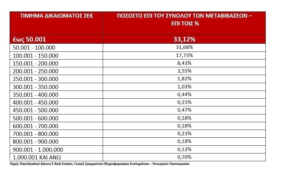 Το 82,53% των οικιστικών μεταβιβάσεων το 2025 πραγματοποιήθηκε με τίμημα έως 150.000 ευρώ. Αξίζει να σημειωθεί ότι το 2019 οι μεταβιβάσεις έως 100.000 ευρώ αντιστοιχούσαν στο 87,25% του συνόλου.