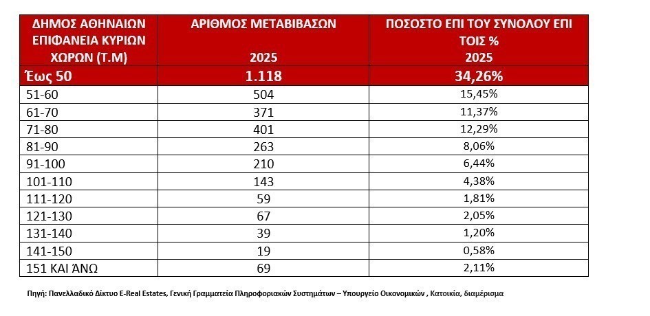 Το 57,92% των μεταβιβάσεων αφορούσε κατοικίες έως 80 τ.μ., ενώ το 34,36% αφορούσε ιδιαίτερα μικρές κατοικίες έως 50 τ.μ.