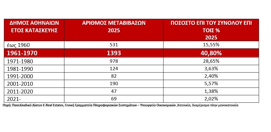 Παράλληλα, το 85% των μεταβιβάσεων το 2025 αφορούσε κατοικίες κατασκευής έως το 1980, δηλαδή ηλικίας τουλάχιστον 45 ετών.