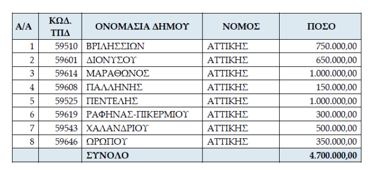 Άμεσα, εξάλλου, με χρηματική εντολή του υπουργείου Εσωτερικών προς το Ταμείο Παρακαταθηκών και Δανείων εκταμιεύονται 4,7 εκατ. ευρώ προς τους πληγέντες δήμους για την κάλυψη έκτακτων αναγκών λόγω της πυρκαγιάς. Το ποσό από τους Κεντρικούς Αυτοτελείς Πόρους του 2024 κατανέμεται ως εξής στους δήμους: