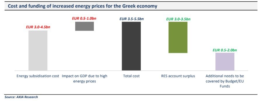 «Πρόσφατα ο υπουργός Οικονομικών Χρήστος Σταϊκούρας δήλωσε ότι κάθε κίνηση 10 ευρώ/MWh στις τιμές του φυσικού αερίου (με όλες τις άλλες συνθήκες να είναι ίδιες) έχει μια καθαρή επίπτωση 600 εκατ. ευρώ στην αύξηση του ΑΕΠ (περίπου 0,3%) σε ετήσια βάση, λόγω της επιβράδυνσης του διαθέσιμου εισοδήματος (αντίστοιχα η Επιτροπή της ΕΕ εκτιμά την επίπτωση στο ΑΕΠ της ΕΕ σε 0,5%). Μια πρόσθετη επίπτωση θα μπορούσε να προκύψει στο δημοσιονομικό μέτωπο, από την πρόσθετη ανάγκη διατήρησης των επιδοτήσεων των καταναλωτών ενέργειας. Τονίζουμε ότι η ικανότητα της κυβέρνησης να περιορίσει τον αντίκτυπο στα νοικοκυριά γίνεται όλο και πιο σημαντική, καθώς ακολουθούνται διαφορετικές προσεγγίσεις/στρατηγικές από διάφορες χώρες της ΕΕ χώρες», εξηγεί η χρηματιστηριακή.