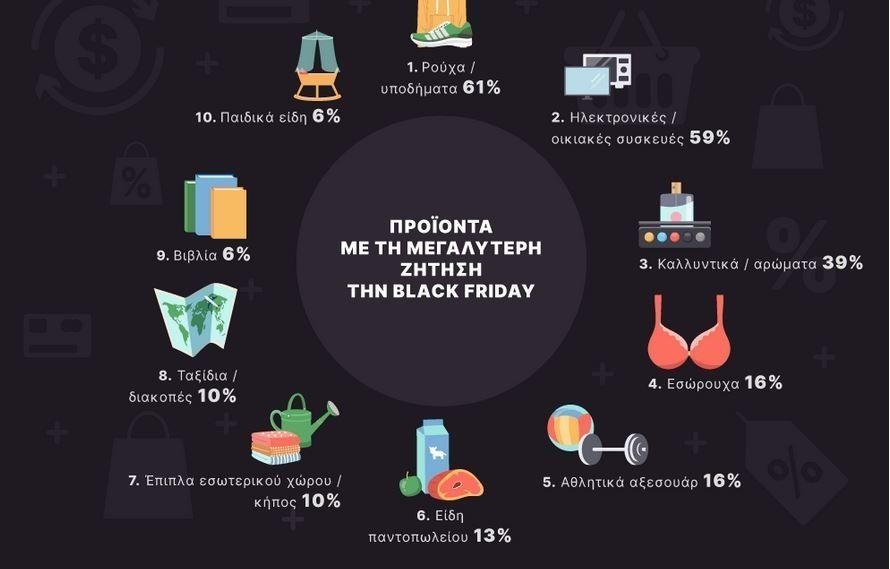 Από την ίδια έρευνα, όμως, προκύπτει και το top-10 των προϊόντων τα οποία στοχεύουν να αγοράσουν κατά τη φετινή Black Friday οι καταναλωτές στην Ελλάδα. Σύμφωνα με την Picodi, οι 10 κορυφαίες κατηγορίες προϊόντων που… καλοβλέπουν οι καταναλωτές για τη Black Friday είναι οι εξής:
