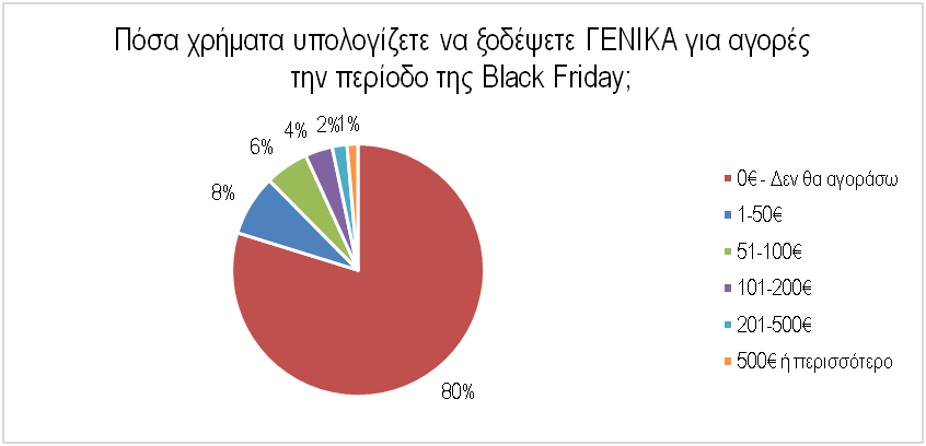 Όπως φαίνεται και στο σχήμα 1, το 20% του καταναλωτικού κοινού δηλώνει ότι θα αγοράσει προϊόντα την περίοδο του blackFriday, δηλαδή 1 στους 5 καταναλωτές. Το ποσοστό αυτό είναι μεγαλύτερο στις ηλικίες 18-44 ετών και ειδικά στο ηλικιακό γκρουπ 25-35 ετών όπου φτάνει το 32%, δηλαδή 1 στους 3 αγοραστές ηλικίας 25-35 ετών θα αγοράσει την εκπτωτική αυτή περίοδο (σχήμα 2). Αντίθετα τα ποσοστά στις ηλικίες άνω των 45 ετών είναι κάτω του 18%. Επίσης είναι 2 φορές πιο πιθανό να αγοράσει κάποιο προϊόν την περίοδο της blackFridayένας καταναλωτής που κάνει συστηματικά ηλεκτρονικές αγορές συγκριτικά με τους υπόλοιπους αγοραστές που επιλέγουν το δίκτυο φυσικών καταστημάτων, κάτι που δείχνει ότι οι onlineαγοραστές είναι αρκετά πιο ενεργοί τη συγκεκριμένη περίοδο με τα ποσοστά να είναι 28% για όσους είναι onlineαγοραστές και 14% για όσου δεν είναι. Όσον αφορά το ύψος της εκτιμώμενης δαπάνης για αγορές την περίοδο του blackFriday για όσους επιλέξουν να αγοράσουν, αυτή μεσοσταθμικά εκτιμάται σε 146€ κατά κεφαλήν. Πρόκειται για μια εκτίμηση δαπάνης άνω των 120 εκατ. ευρώ. Το 80% εκτιμά ότι δεν θα δαπανήσει τίποτα, το 8% μέχρι 50 ευρώ, το 6% έως 100 ευρώ, το 4% από 101 έως 200 ευρώ, το 2% από 200 έως 500 ευρώ και το 1% πάνω από 500 ευρώ.