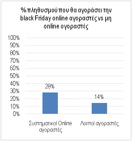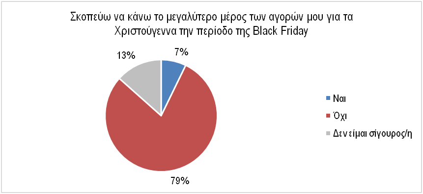 Ένα σημαντικό μερίδιο αυτών των αγορών αφορούν τις αγορές των Χριστουγέννων, όπως καταγράφεται στο σχήμα 2. Συγκεκριμένα από το 20% το οποίο θα πραγματοποιήσει αγορές την περίοδο του BlackFridayτο 7%, δηλαδή περίπου 1 στους 3, θα κάνει το μεγαλύτερο μέρος των αγορών του για τα Χριστούγεννα την περίοδο του BlackFriday.