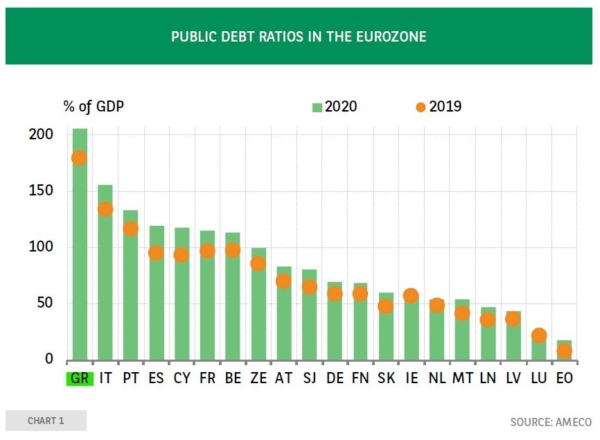 Η Ελλάδα ήταν από τις χώρες που επλήγησαν περισσότερο επειδή ο τουρισμός αποτελεί σημαντικό παράγοντα της οικονομικής δραστηριότητας. Εξετάζοντας τα επίπεδα χρέους προς ΑΕΠ στο τέλος του έτους 2020, ο δείκτης στην Ελλάδα ήταν στο 205,6% του ΑΕΠ και ο μεγάλος φόβος είναι ότι η κρίση του Covid-19 θα μπορούσε μετατραπεί σε ένα άλλο σοκ εντός Ευρωζώνης, αν και αξίζει να επισημανθεί ότι η αύξηση των δεικτών χρέους δεν συνοδεύτηκε απαραίτητα από μια απότομη επιδείνωση της βιωσιμότητας του ευρωπαϊκού δημόσιου χρέους.