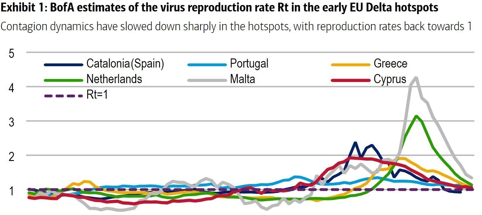 Η μετάλλαξη Δέλτα εξακολουθεί να αποτελεί μείζονα ανησυχία σύμφωνα με την Bank of America Global Research, αλλά τα πρόσφατα δεδομένα από τις πρώτες εστίες εντός της ΕΕ σε Ελλάδα, Πορτογαλία και Ισπανία δίνουν κάποιες συγκρατημένες ελπίδες ότι οι μικροί περιορισμοί, σε συνδυασμό με την πρόοδο στον εμβολιασμό, αρκούν για να ισοπεδώσουν την καμπύλη του ιού, εξηγεί η αμερικανική τράπεζα.