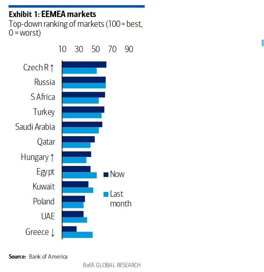 Η κατηγοριοποίηση που χρησιμοποιεί η Bank of America Global Research βάσει ενός σταθμισμένου μέσου όρου έξι διαφορετικών δεικτών προτίμησης δείχνει ότι η εγχώρια αγορά μετοχών είναι συνολικά στην τελευταία θέση και Ηνωμένα Αραβικά Εμιράτα και Πολωνία ακολουθούν ως οι χειρότερες αγορές τη δεδομένη χρονική στιγμή.