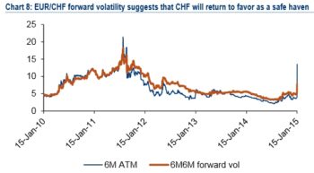 Η κίνηση στην ισοτιμία ευρώ/ελβετικού φράγκου δεν έχει προηγούμενο, από την εποχή της διάλυσης του Breton Woods. Και πιθανότητα θα χρειαστεί πολύς χρόνος για να ισορροπήσει η ισοτιμία των δυο νομισμάτων. Παράλληλα, η BofA Merrill Lynch βλέπει πιθανή περαιτέρω υποχώρηση στην ισοτιμία ευρώ/γεν, εν μέρει λόγω και της κατάστασης του γεν που φρονείται ως ασφαλές καταφύγιο , ενώ η προηγούμενη μεταβλητότητα της ισοτιμίας ευρώ/ελβετικού φράγκου (EUR/CHF) υποδεικνύει ότι το CHF θα ξαναγίνει ασφαλές καταφύγιο.
