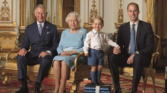 Αυτή είναι η βασίλισσα του κάστρου και αυτός το μικρό καθαρματάκι της! Ο αξιολάτρευτος πρίγκιπας Γεώργιος ποζάρει πεφήφανα -έχοντας κερδίσει μερικούς πόντους- στο πλευρό της προγιαγιάς του, του παππού του και του πατέρα του.