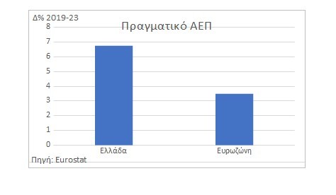 4. Σωρευτικά είχαμε 6,8% ανάπτυξη του πραγματικού ΑΕΠ 2019-23 έναντι 5,8% προηγουμένως. Σημειώνεται ότι η Ευρωζώνη είχε ανάπτυξη του πραγματικού ΑΕΠ 3,5% το ίδιο διάστημα, δηλαδή λιγότερο από το μισό της Ελλάδας, και η ΕΕ-27 είχε ρυθμό 4%.
