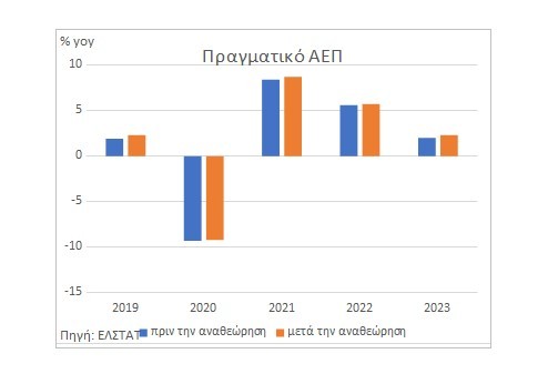 Εκτίμηση για αύξηση του ΑΕΠ κατά 2,3% για το 2023 αντί για 2% και αύξηση των επενδύσεων κατά 6,6% αντί για αρχική εκτίμηση 4% περιλαμβάνουν τα αναθεωρημένα στοιχεία των ετών 1995-2022 που ανακοίνωσε σήμερα η Ελληνική Στατιστική Αρχή (ΕΛΣΤΑΤ), στο πλαίσιο της 2ης εκτίμησης των Ετήσιων Εθνικών Λογαριασμών έτους 2023. Οι αλλαγές στην μεθοδολογία της ΕΛΣΤΑΤ περιλαμβάνουν τις συνηθισμένες αναθεωρήσεις που γίνονται αυτή την περίοδο σε ολόκληρη την Ευρωπαϊκή Ένωση.