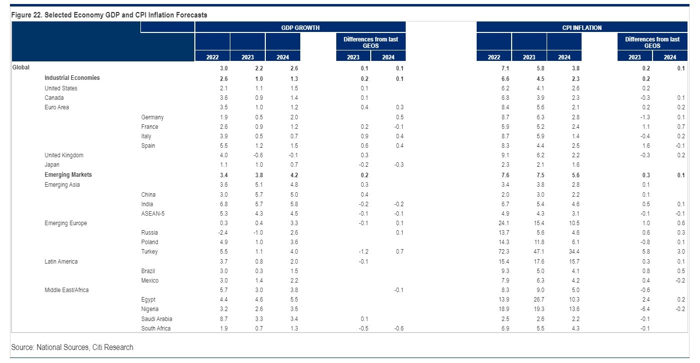 Η Citigroup για την Ευρωζώνη προβλέπει ισχνή άνοδο του ΑΕΠ 1% φέτος και μόλις 1,2% το 2024. Ο πληθωρισμός θα παραμείνει αυξημένος στο 5,6% φέτος και στο 2,1% το 2024. Για το τρίμηνο που ολοκληρώθηκε πέρυσι, η εκτίμηση της τράπεζας είναι 10% και για το πρώτο τρίμηνο φέτος στο 8,1%, στο 6,5% το δεύτερο τρίμηνο, στο 4,9% τρίτο και 3,1% στο τελευταίο τρίμηνο του έτους. Για την παγκόσμια ανάπτυξη η επίδοση φέτος θα είναι +2,2% και 2,4% το 2024. Οι αποδόσεις των 10ετών ομολόγων θα κυμανθούν από 3,65% το α’ τρίμηνο φέτος έως 3,25% στο τέλος του έτους για τις ΗΠΑ. Τα γερμανικά Bunds από το 2,40% στο α’ τρίμηνο θα μειωθούν σταδιακά σε 2,25% στο τέλος του έτους και στο 2% στο τέλος του 2024.