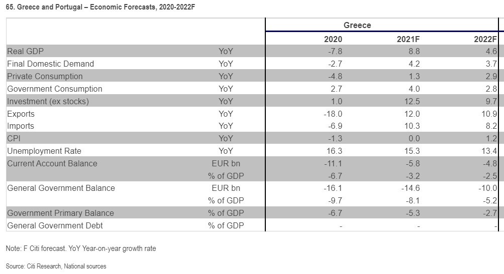 Η Citi αναθεωρεί αισθητά προς τα πάνω την αύξηση του ελληνικού ΑΕΠ το 2021 στο εντυπωσιακό 8,8% (από περίπου 5,3% πριν) και αναθεωρεί ελαφρώς προς τα κάτω την πρόβλεψή της για το 2022 προκειμένου για να αντικατοπτρίσει το υψηλότερο σημείο εκκίνησης.