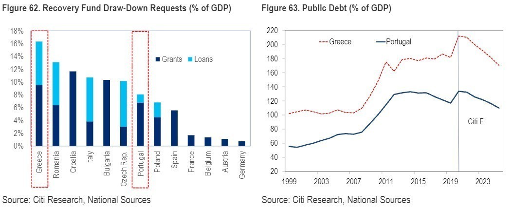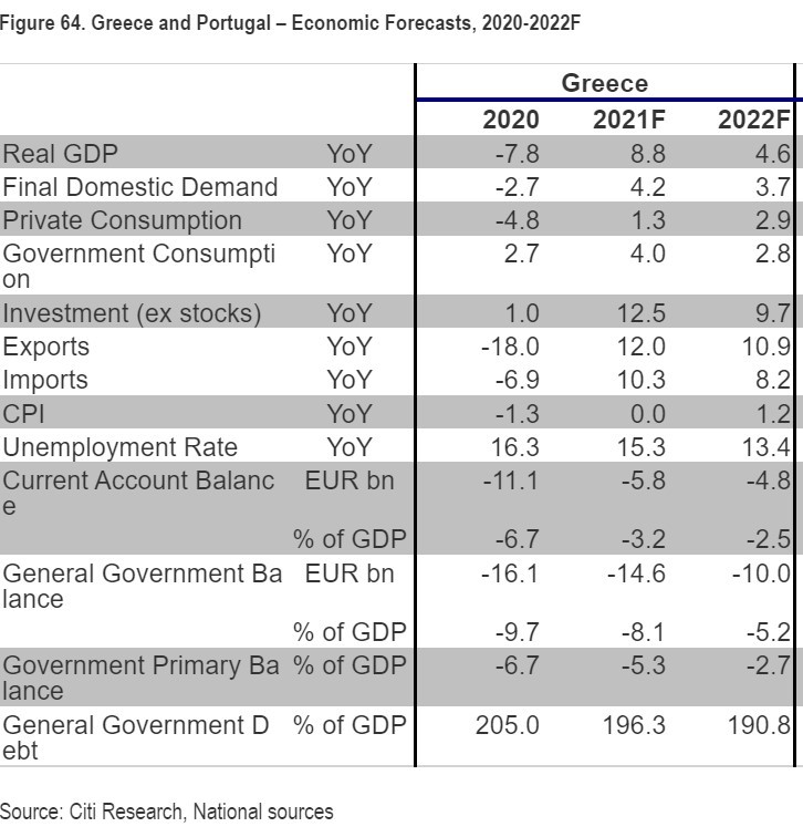 Η Citigroup αναμένει πλέον αύξηση του ΑΕΠ το 2021 κοντά στο 9% τώρα και επιβράδυνση της ανάπτυξης το 2022 σε περίπου 4,5%. Οι άφθονοι πόροι του NextGenEU αναμένεται να στηρίξουν την ανάπτυξη τα επόμενα χρόνια. Το ελληνικό σχέδιο ανάκαμψης δεσμεύει το μεγαλύτερο ποσό πόρων ως ποσοστό του ΑΕΠ στην Ευρωζώνη, στο 16% του ΑΕΠ τα επόμενα 6 χρόνια (εκ των οποίων σχεδόν 10% σε επιχορηγήσεις).