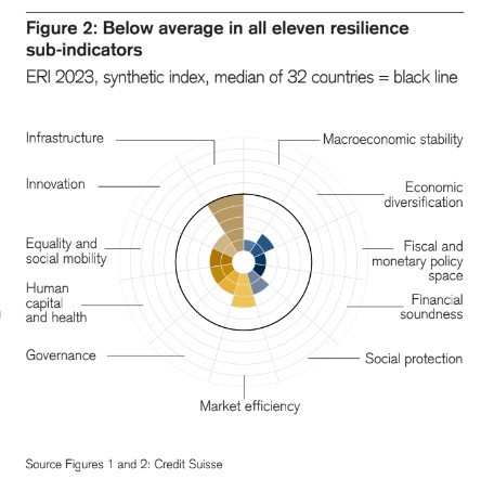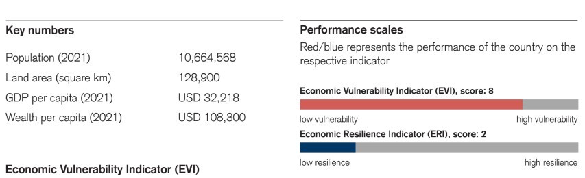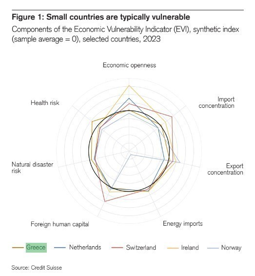 H Credit Suisse σε ανάλυσή της για τις μικρές οικονομίες, η οποία περιλαμβάνει και τη χώρα μας, αναλύει τις δυνάμεις και τις αδυναμίες των μικρών οικονομιών μέσω δύο δεικτών. Ο πρώτος αφορά την οικονομική ευπάθεια (EVI – Economic Vulnerability Indicator) και ο έτερος την οικονομική ανθεκτικότητα (ERI – Economic Resilience Indicator). Ο πρώτος δείκτης μετρά την έκθεση μιας οικονομίας σε διάφορα σοκ, ενώ ο δεύτερος αξιολογεί την οικονομική ευρωστία της χώρας για την αντιμετώπιση των παραπάνω σοκ αλλά και την ετοιμότητα προσαρμογής στις οικονομικές συνθήκες.