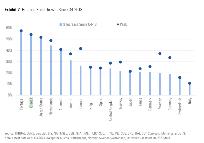 Την ίδια στιγμή όμως, σε πραγματική πρόκληση αναδεικνύεται η αγορά στέγης, με την Πορτογαλία και την Ελλάδα στις δύο πρώτες θέσεις στις αυξήσεις τιμών (σχεδόν 60% και 55% αντίστοιχα)