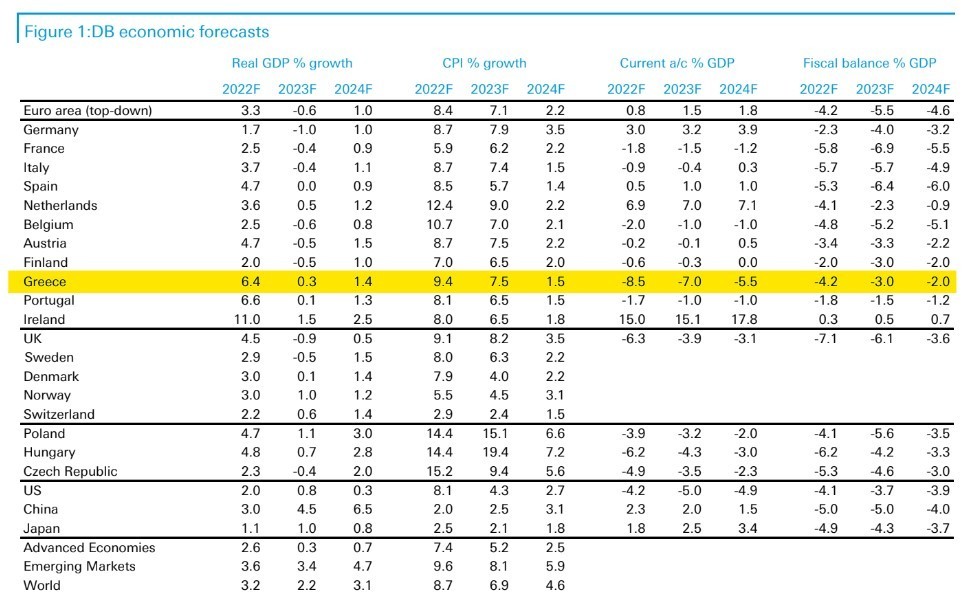 Η Ελλάδα το 2023 μόλις που θα αποφύγει την ύφεση με ρυθμό ανάπτυξης 0,3%, σύμφωνα με τις προβλέψεις της Deutsche Bank, ενώ η γερμανική τράπεζα εκτιμά ότι η χώρα μας θα επιδείξει αύξηση στο ΑΕΠ 6,4% φέτος. Η ύφεση στην Ευρώπη που έχει ήδη ξεκινήσει και ο κίνδυνος εμφάνισης ύφεσης double dip στην υπόλοιπη Ευρώπη είναι μεγάλος και αυτό έχει μεγάλο κόστος για την εγχώρια οικονομία και προβλέπει ότι η ανάπτυξη το 2024 δεν θα «απογειωθεί» και θα κινηθείς στα επίπεδα του 1,4%.
