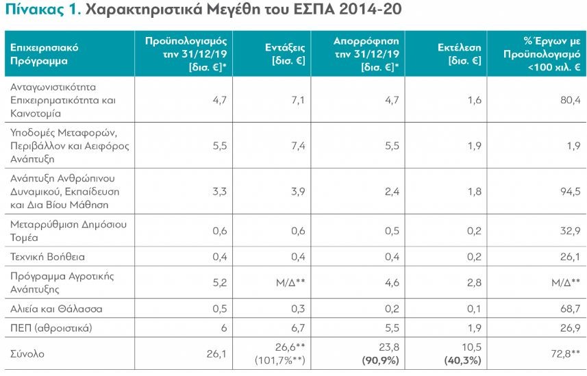 Κατά συνέπεια, ένα πολύ μεγάλο μέρος των κονδυλίων του ΕΣΠΑ, περίπου €13,2 δισ., λιμνάζει στα δημόσια ταμεία, τα οποία δεν μπορούν να το διαθέσουν στην οικονομία πριν από την υλοποίηση των σχετικών προγραμμάτων. Η κατάσταση θα ήταν πολύ χειρότερη, εάν δεν εντάσσονταν στο ΕΣΠΑ επιπλέον προγράμματα, λόγω του κορωνοϊού, με σχετική ευκολία στην απορρόφηση και την εκτέλεση, όπως το Ταμείο Εγγυοδοσίας Επιχειρήσεων COVID-19.